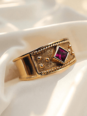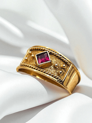 ¡Un símbolo de elegancia y pasión! Anillo de oro de 18 quilates estilo tricillo con rubí, pesa 2.7 gramos. Incluye caja de regalo y garantía de por vida sobre la calidad del oro.
