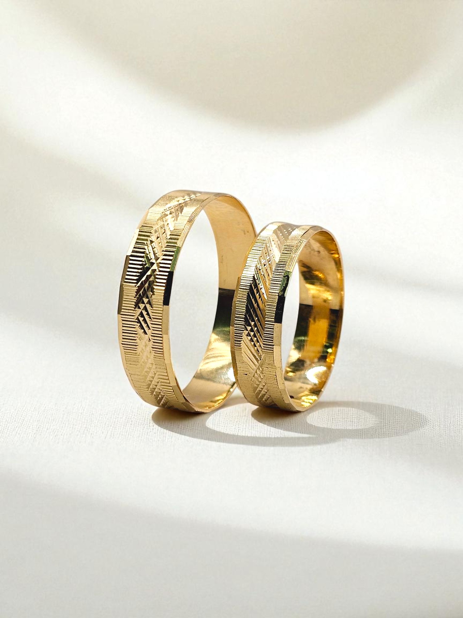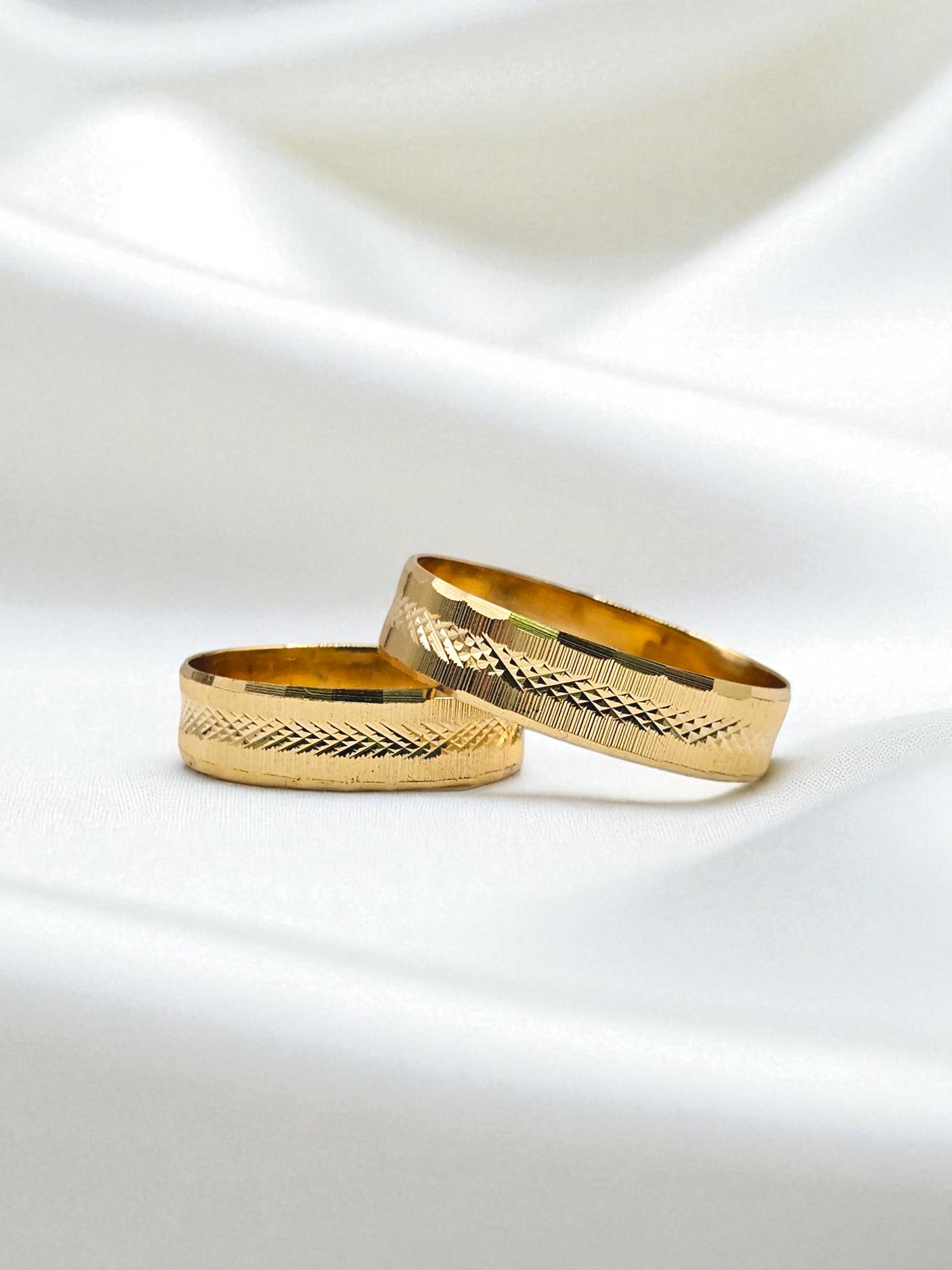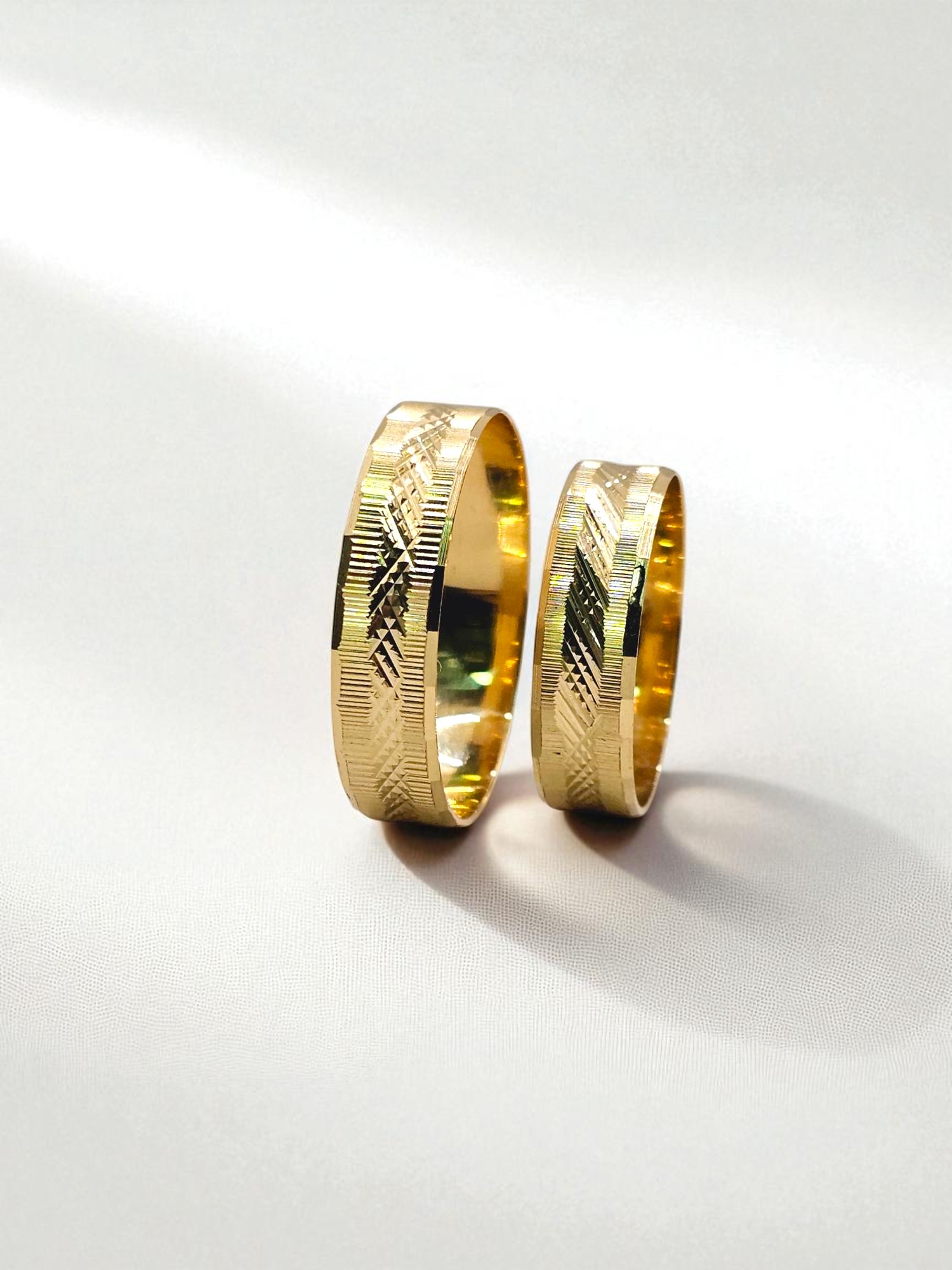 ¡Unión con textura y diseño único! Argollas de matrimonio talladas rayas y rombos de 5 mm y 5 grs en oro 18k. Incluye caja de regalo y garantía de por vida sobre la calidad del oro.