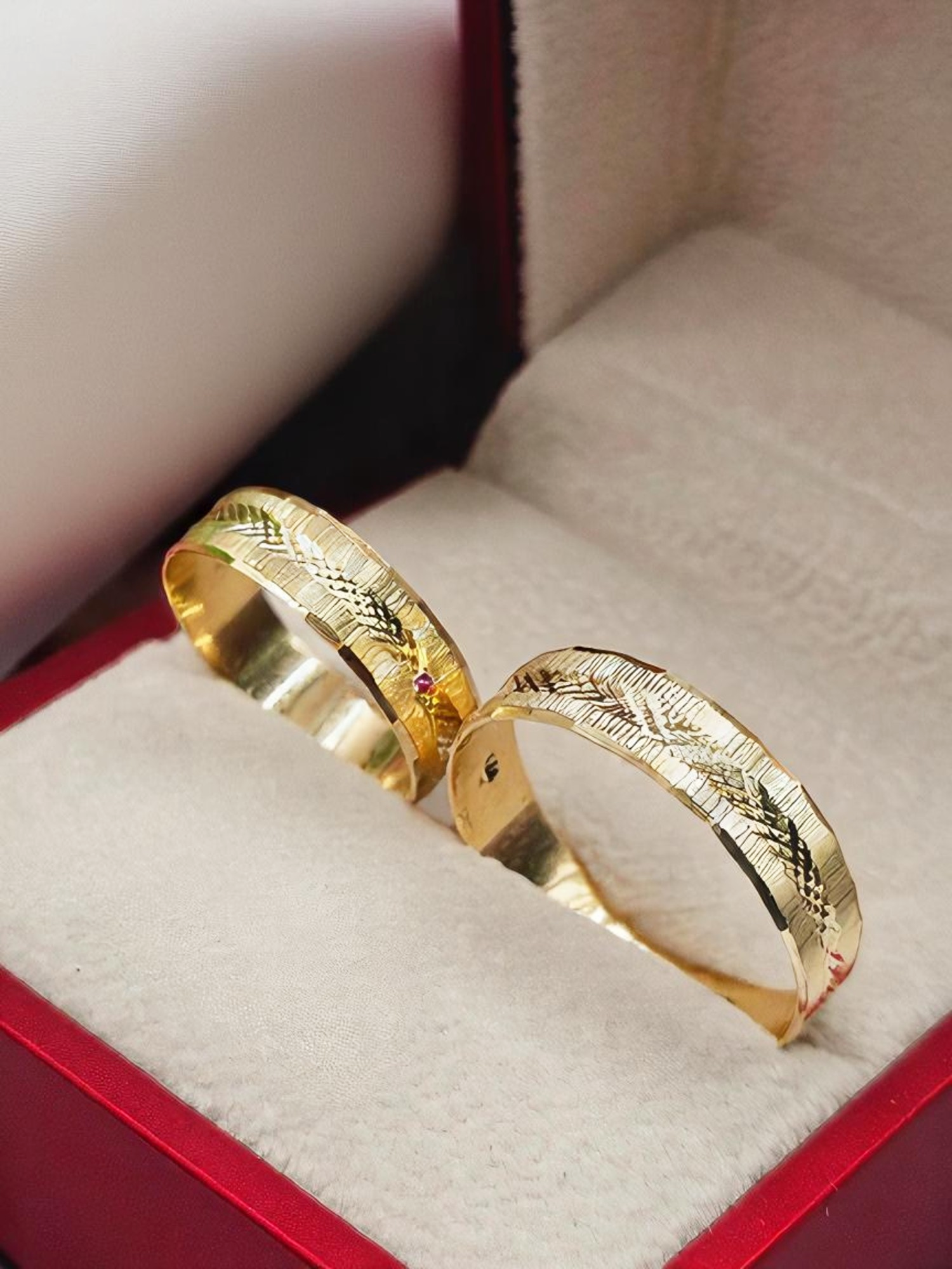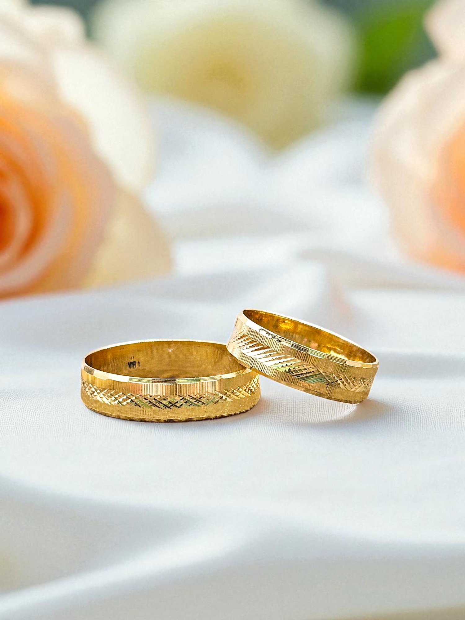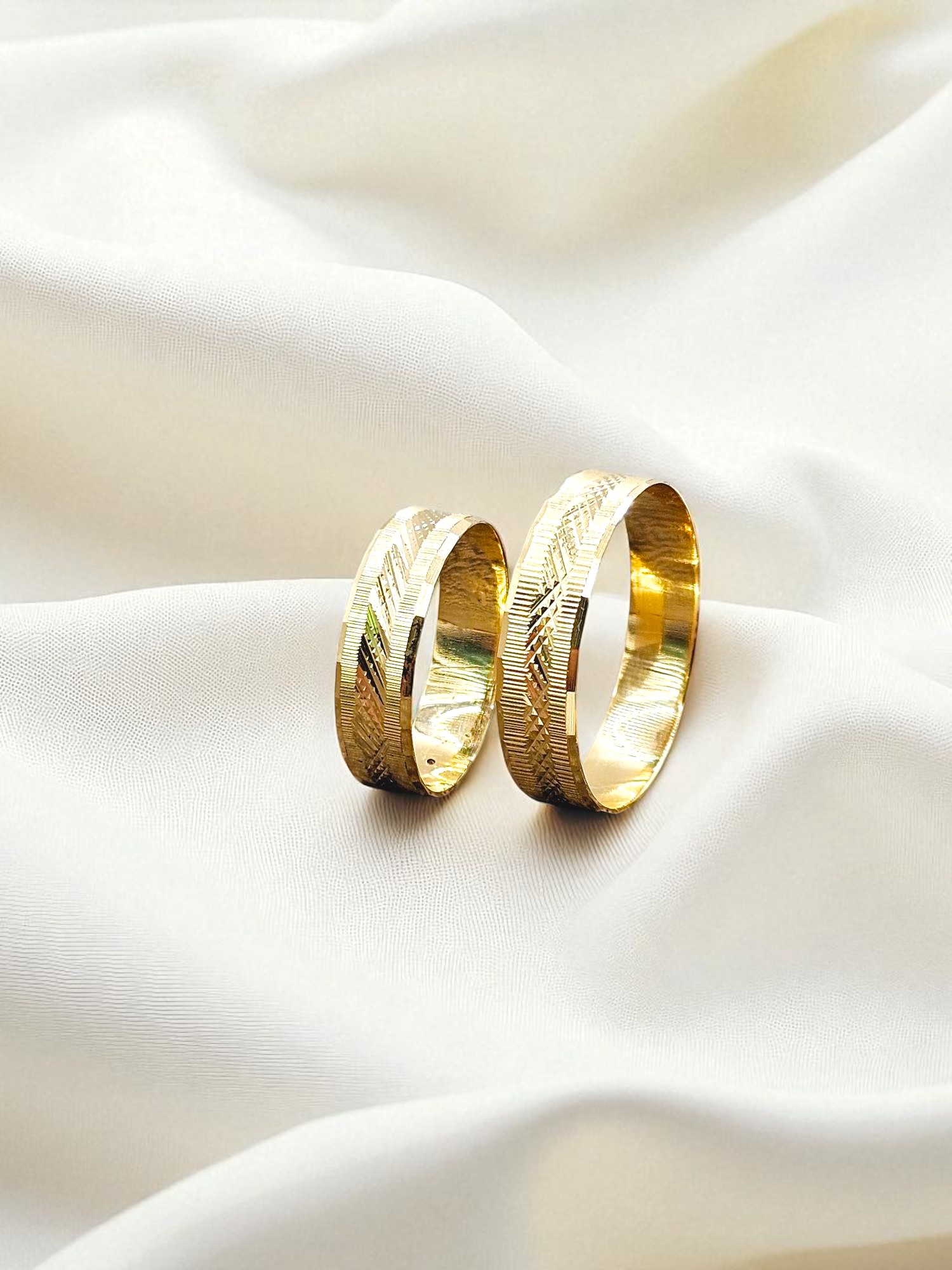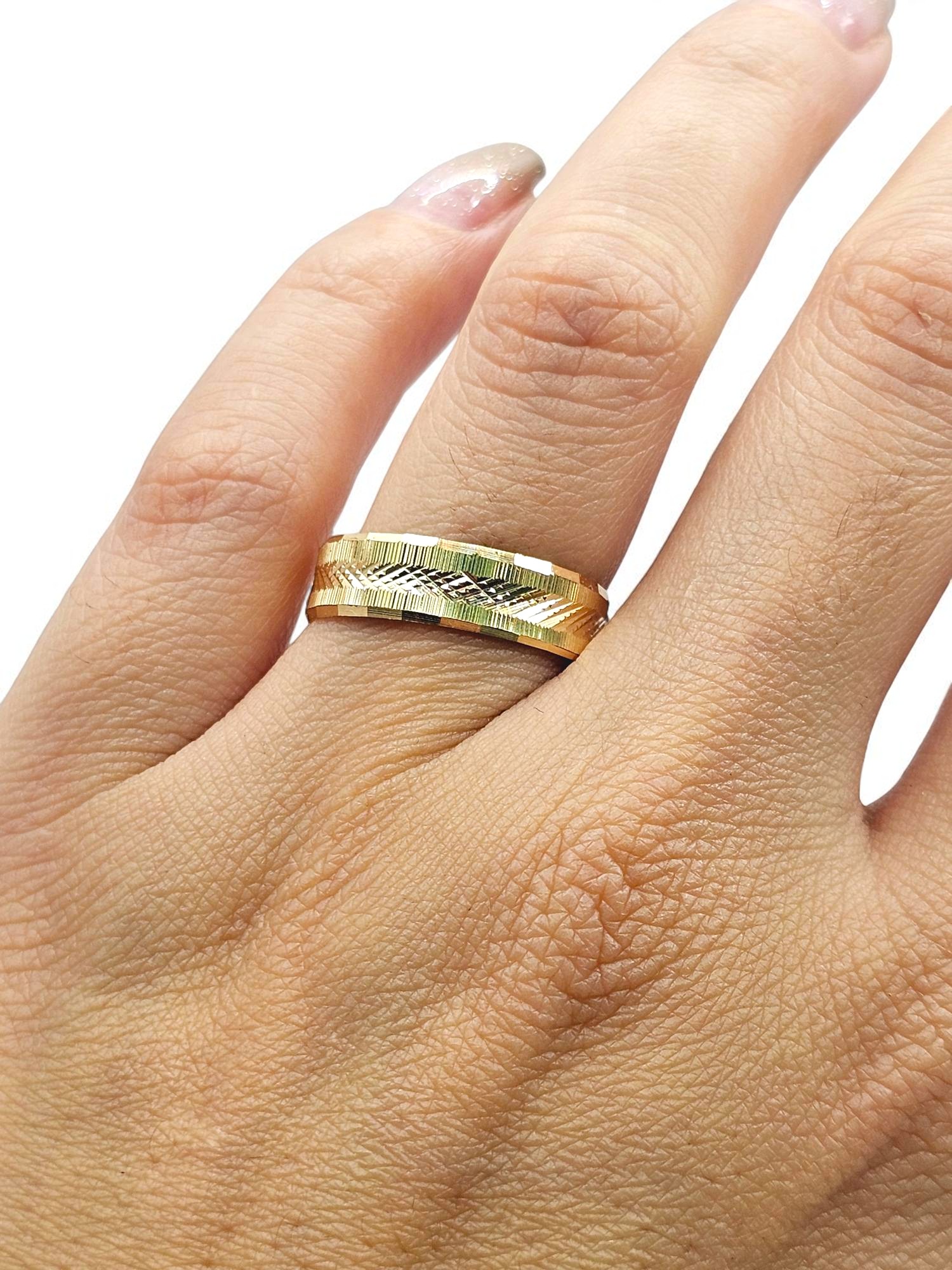 ¡Unión con textura y diseño único! Argollas de matrimonio talladas rayas y rombos de 5 mm y 5 grs en oro 18k. Incluye caja de regalo y garantía de por vida sobre la calidad del oro.