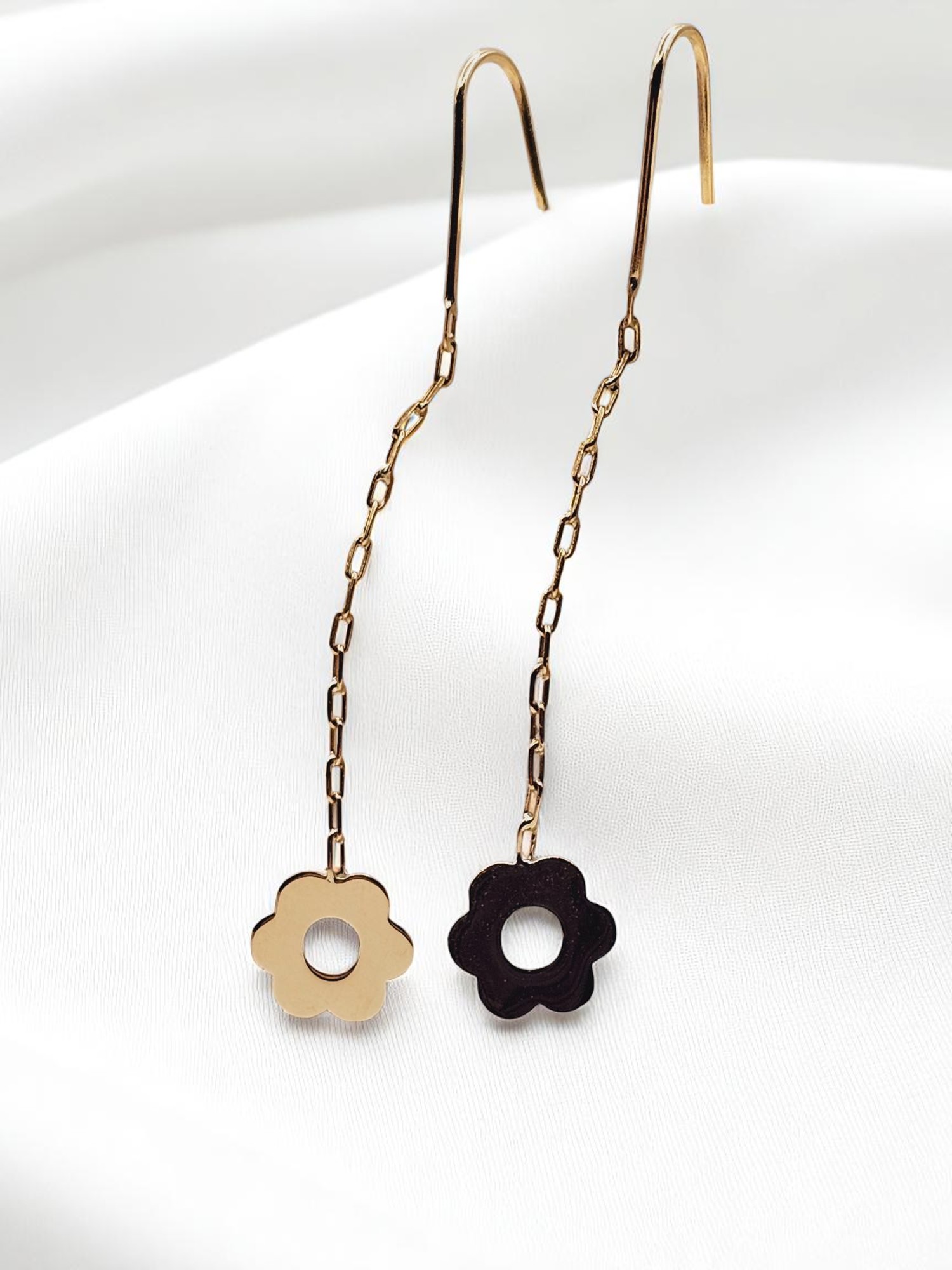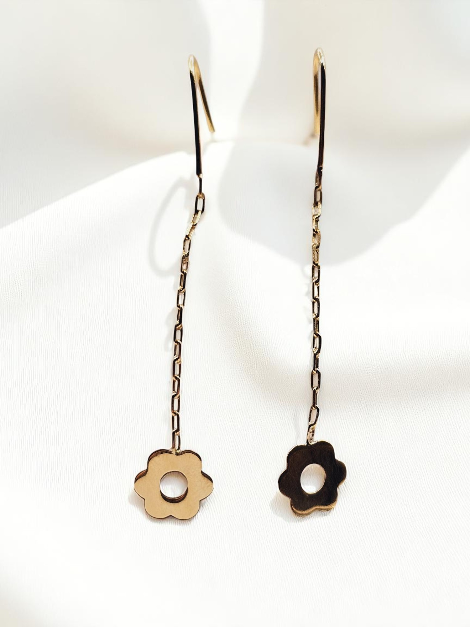 ¡Un jardín de elegancia que se balancea contigo! Aros cadena con margaritas de 5.3 cm y 1.4 grs en oro 18k. Incluye caja de regalo y garantía de por vida sobre la calidad del oro.